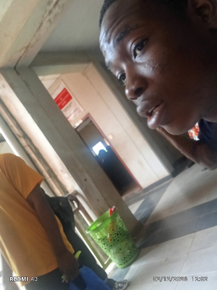 A person with dark skin is in the foreground, looking to the right. A second person wearing a yellow shirt is to the left. In the background, there is a hallway with a doorway leading into a dark room. A green waste bin is next to the person in the yellow shirt. The image is taken at a tilted angle, showing the ceiling and floor. A date stamp in the corner reads "02/12/2026".