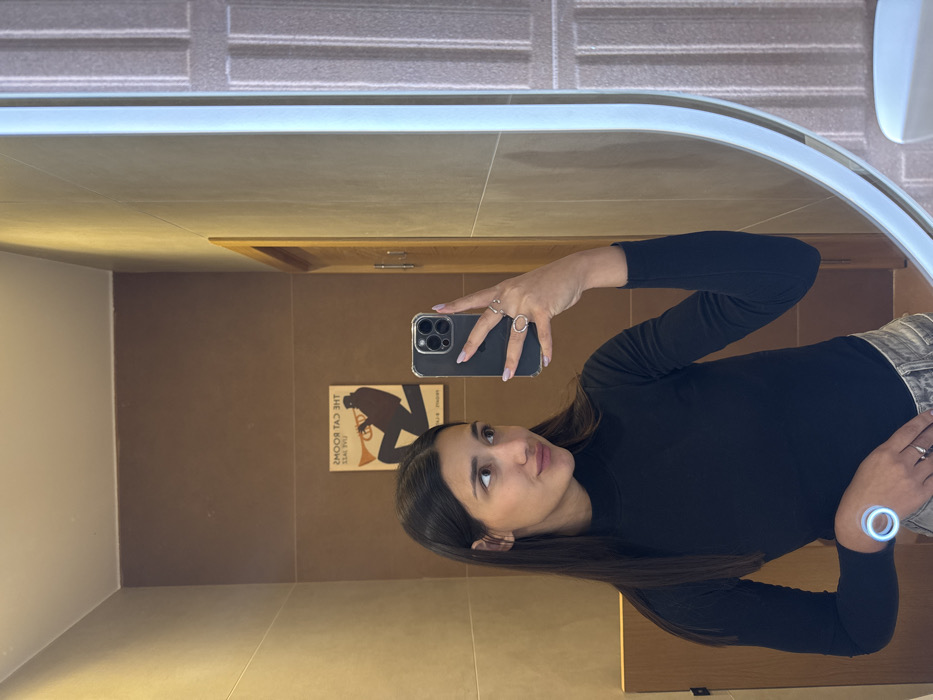 A young female subject is captured in a mirror selfie within an indoor establishment in Donja Lastva, Montenegro