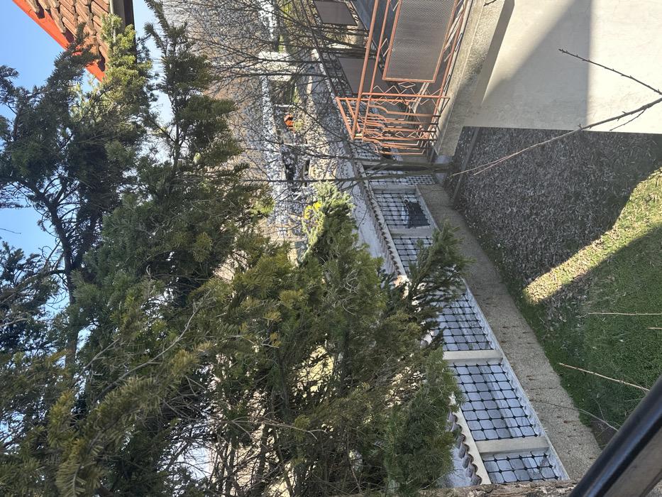 The scene depicts an elevated view of a residential or semi-residential area in Voluyak, Bulgaria, under bright daylight. A large evergreen tree with dark green needles dominates the upper left and central-left foreground, partially obscuring the background. To the right, a concrete balcony with a rusted, reddish-brown metal railing featuring geometric cutouts extends into the frame. Below the evergreen tree and railing, a concrete wall with a black metal grid-pattern fence and terracotta-colored tile coping separates a small, unkempt yard from a visible street or path beyond. The yard area features a patch of green grass, a larger section covered with dry, fallen leaves, and several bare, thin tree branches. A single, slender, leafless tree stands centrally within this yard section, near the fence. Beyond the fence and yard, a paved surface, likely a street, is visible. Several deciduous trees with bare branches line this thoroughfare. In the distant background, a red-tiled roof is discernible, alongside other indistinct structures and a yellow object. The sky is clear blue overhead. Harsh sunlight from the right casts prominent, dark shadows across the ground and the building walls. No individuals or animals are present.