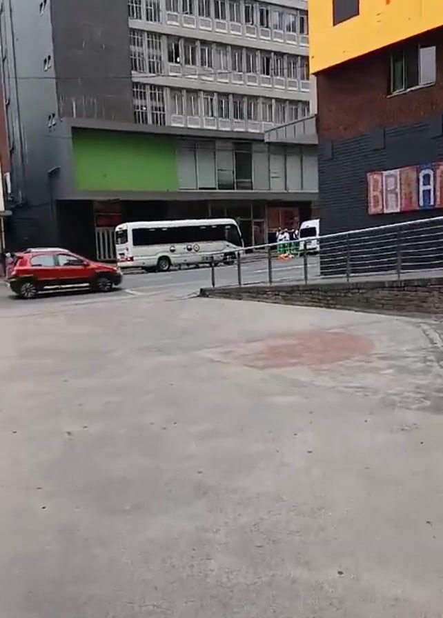 street scene with several buildings visible. In the foreground, there is a paved area with a low brick and metal railing separating it from the street. A white bus with colorful decals and a white van are parked on the street. A group of people wearing white shirts and lime green pants are standing near the entrance to a building. A red car drives by on the street. An orange sign with the words "SOUTH POINT" in a circular logo is mounted on the side of a building. The word "BRARMI" is painted on a wall, with the letters slightly obscured. A tall building with many windows is visible in the background.