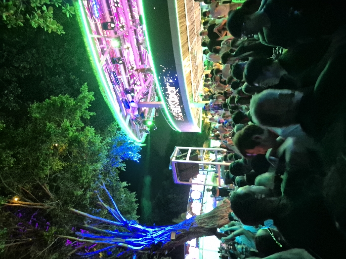 A crowded nighttime scene reveals people in dark clothing facing a bright stage. A large Ferris wheel glows with green, purple, and white lights. Trees with blue and purple illuminated branches frame the left side of the view. A secondary stage with lighting is visible in the background. The angle is tilted, giving a somewhat disorienting perspective.
