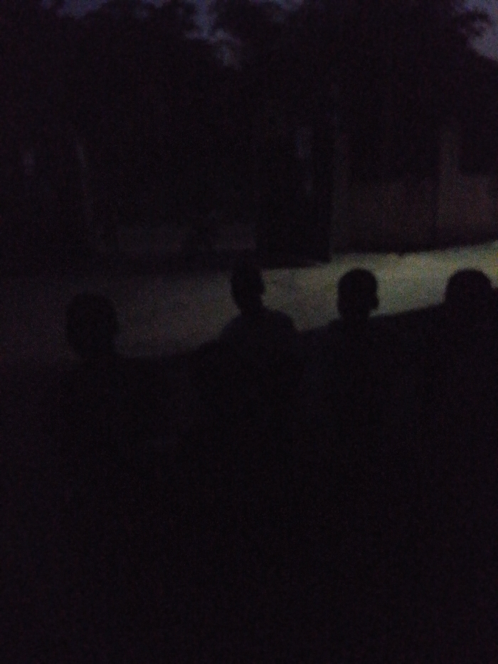 Four shadowy figures stand in a row against a dark, blurry backdrop of trees and a structure resembling a building. The scene is dimly lit, possibly at dusk or night, rendering the individuals as silhouettes. Their features are indiscernible, emphasizing their forms against the lighter ground. The lack of detail obscures the context and creates an eerie atmosphere.