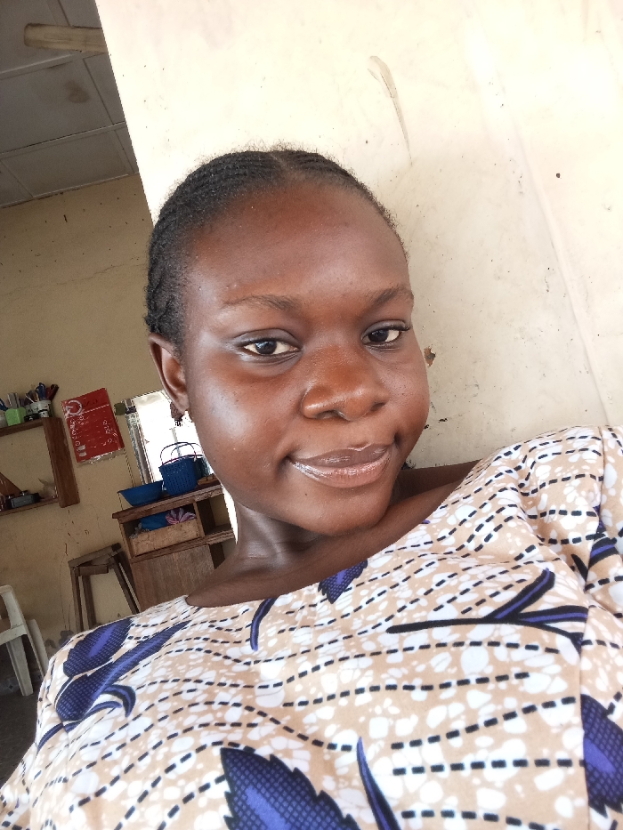 A dark-skinned woman with braided hair faces the camera, smiling softly. Her attire includes a light-colored top with a print of white splotches and large blue leaves. In the background, there's a simple interior scene featuring off-white walls, a shelf holding various items, and a glimpse of a window. The overall impression is of a casual, close-up portrait within a modest domestic setting.