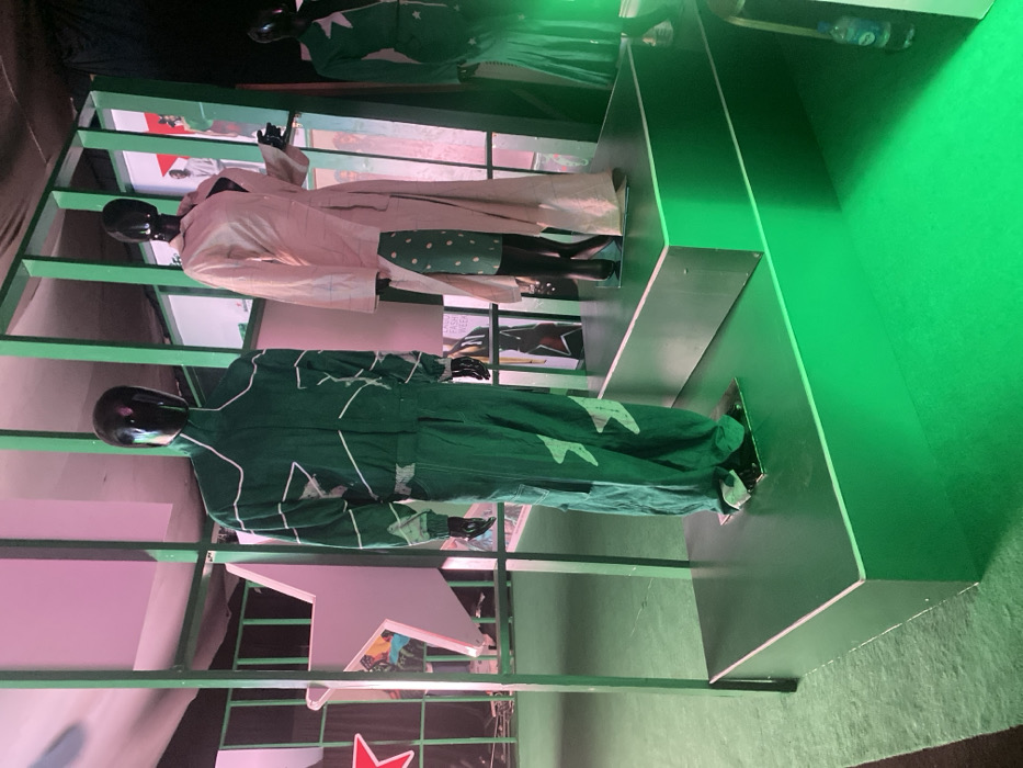 This image depicts an indoor fashion exhibition display located in Itirin, Nigeria. The scene features three black, headless mannequins positioned on green, rectangular display platforms against a backdrop of green grid structures and illuminated panels. The mannequin on the left stands on a lower platform, wearing a dark green jumpsuit adorned with white abstract lines and white star motifs. The central mannequin, on a taller platform, is dressed in a light tan/cream long, collared, trench-coat style top over a dark green garment with white polka dots, and black boots; its left arm is bent with the hand extended. A third mannequin, partially visible on the far right, wears a dark green two-piece outfit featuring white star motifs, comprising a top and a flared skirt. The floor is covered in green material, and the display platforms are also green. A prominent green grid structure frames the central part of the display. Behind this grid, several illuminated vertical panels showcase images, with "LAGOS FASHION WEEK" text partially visible on one. To the far left, a large white five-pointed star cutout is visible, with a red star logo partially obscured behind it. The environment is lit with a dominant green light, especially on the floor and platforms, creating a vivid glow, complemented by pink lighting in the upper background. A clear plastic water bottle with a blue cap rests on the green floor to the right.