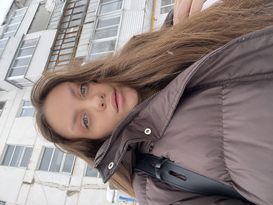 A young woman is depicted in a close-up, outdoor selfie, presenting her upper torso and head. She has long, straight, light brown hair, green eyes, and a neutral expression with slightly parted lips. A reddish tint is visible on her eyelids. She wears a brown, quilted puffer jacket, zipped to the collar, with a black strap from a bag or backpack visible over her left shoulder. Snowflakes are discernible in the air around her hair. Behind her is a multi-story residential apartment building, typical of Soviet-era construction, with a light-colored, likely white or off-white, facade that shows signs of weathering, including visible cracks and discoloration. The building features numerous windows and a series of enclosed balconies or loggias. Some balconies appear more recently renovated with white paneling, while others exhibit older, wooden-framed enclosures. Snow is accumulated on the ground and various ledges of the building. The scene takes place in a snowy, urban environment consistent with Chaikovsky, Russia, although the precise street address is not ascertainable from the image.