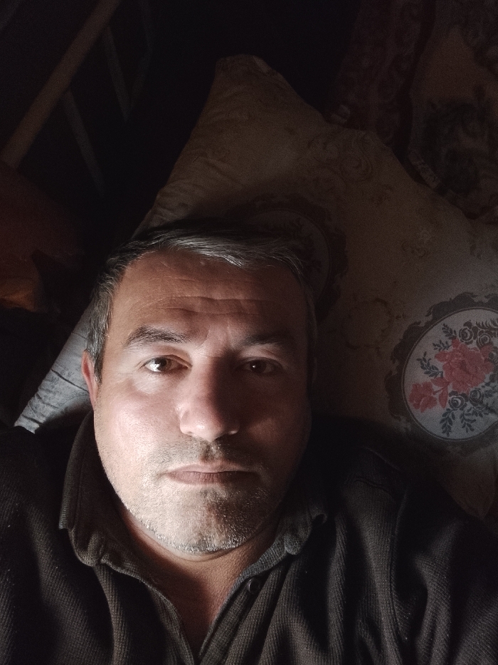 An adult male is depicted in a close-up, eye-level indoor portrait. The subject, presumed to be within a private residence in Qoraqosh, Uzbekistan, has short, greying dark brown hair and light facial stubble. He is wearing a dark brown collared shirt and is positioned centrally in the frame, from the upper torso upwards. The male is lying down, his head supported by a light grey textured pillow to his left and a beige patterned pillow to his right. The beige pillow features a distinct circular motif with pink and red floral designs. He looks directly forward, maintaining eye contact with the camera, with a neutral expression. The environment is dimly lit, with a visible light source illuminating the subject's face from the upper left, casting the background into deep shadow, indicative of an enclosed interior space.