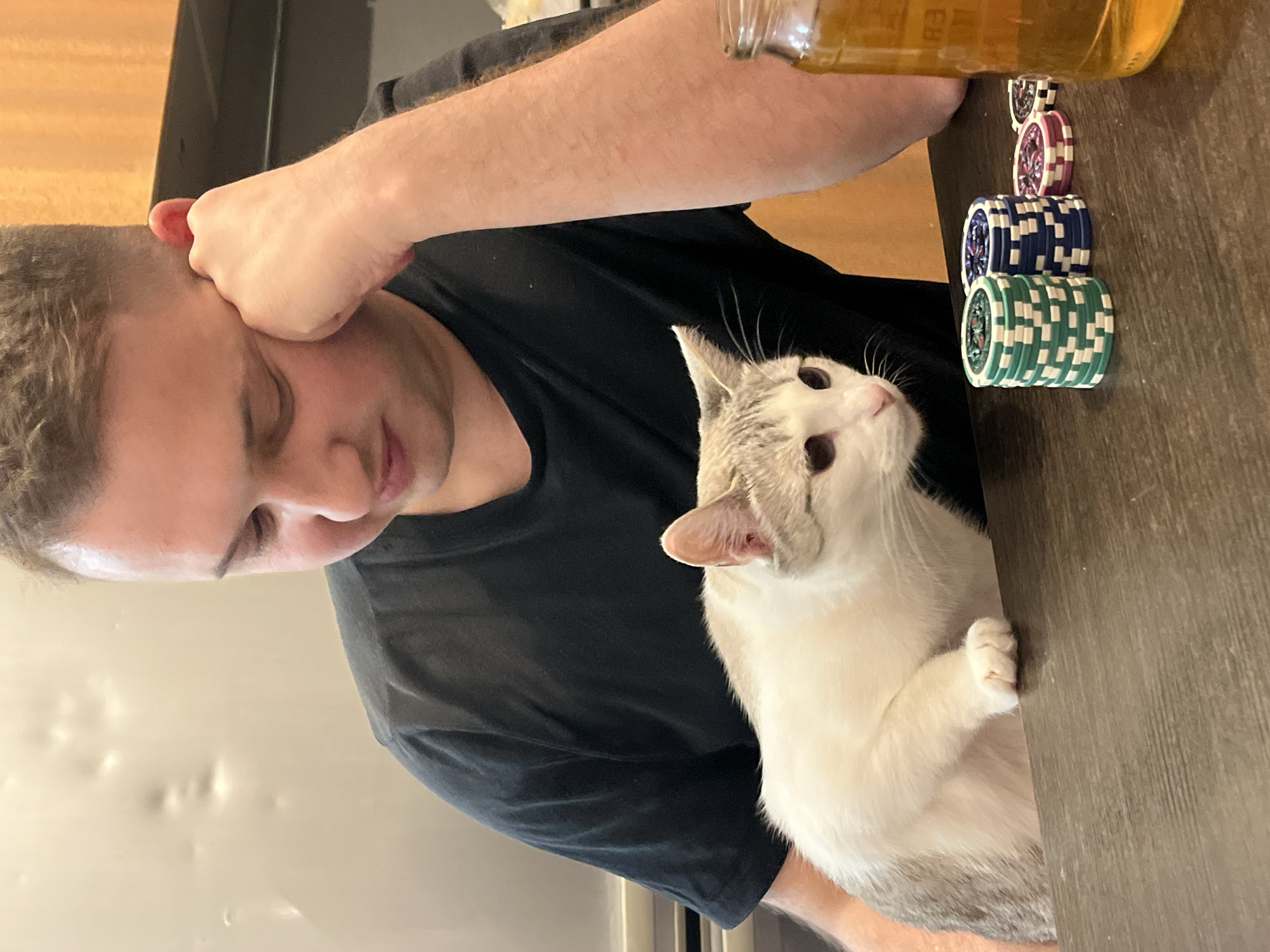 A person is sitting at a table with a cat. The person is wearing a black t-shirt and has their hand on their head. The cat is mostly white with some grey markings, and is looking up. There is a stack of poker chips and a jar of liquid on the table. The location is not identifiable from the image.