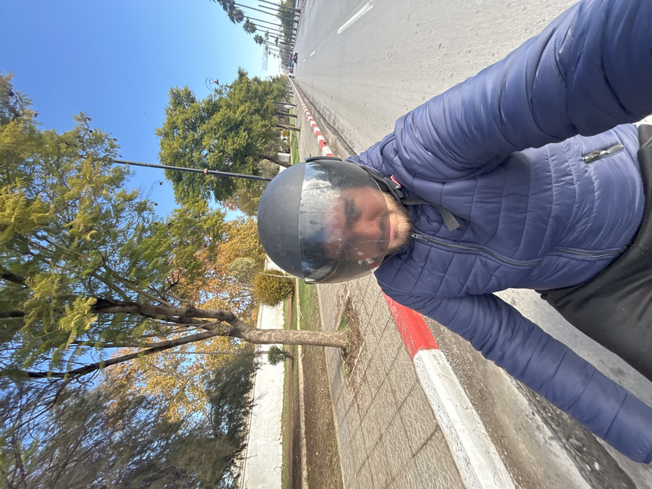 A male subject is prominently featured in the foreground, wearing a dark blue quilted jacket, black trousers, and a black motorcycle helmet with a clear visor that reveals his bearded face. The image is captured from a first-person perspective, suggesting the subject is operating a vehicle. To the subject's immediate left, a paved sidewalk with square tiles abuts a white curb topped with a red stripe. Beyond the curb, a narrow strip of earth with sparse foliage and a tree trunk runs parallel to a continuous low white wall. Deciduous trees with green and golden-brown leaves are visible behind the wall. To the right, a multi-lane asphalt road recedes into the distance, showing a few small vehicles, and is lined with utility poles and palm trees. The sky is clear and bright blue. The scene is set in Mechouar Fes Jdid, Morocco.