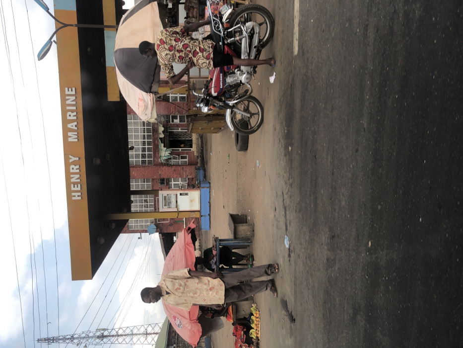 The image portrays a roadside scene in Ogbaku, Nigeria, centered around a "HENRY MARINE" gas station