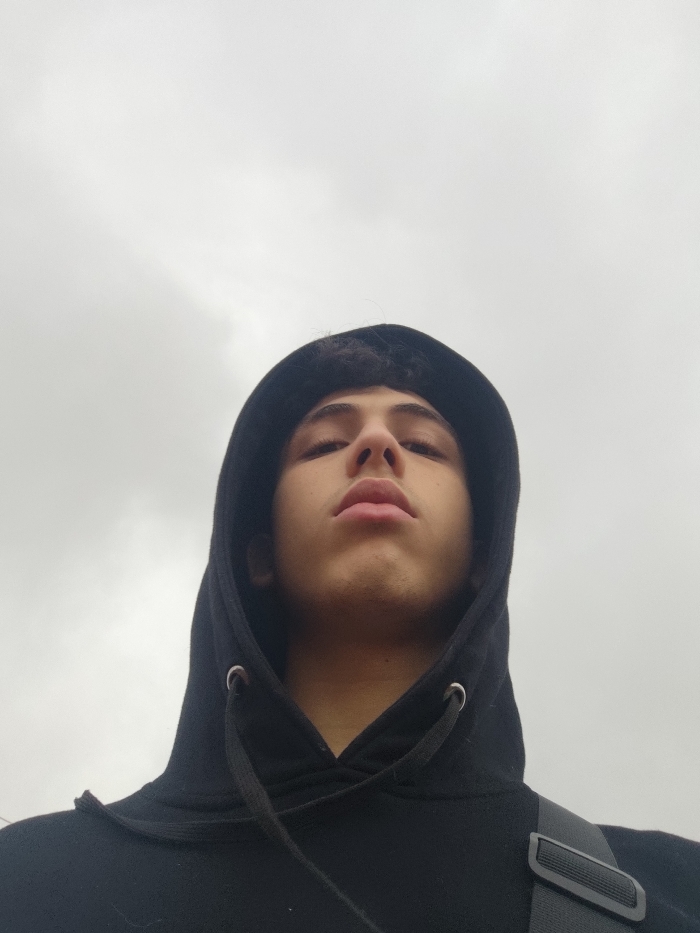 This image captures a young male from a low-angle perspective, looking directly upwards at the camera