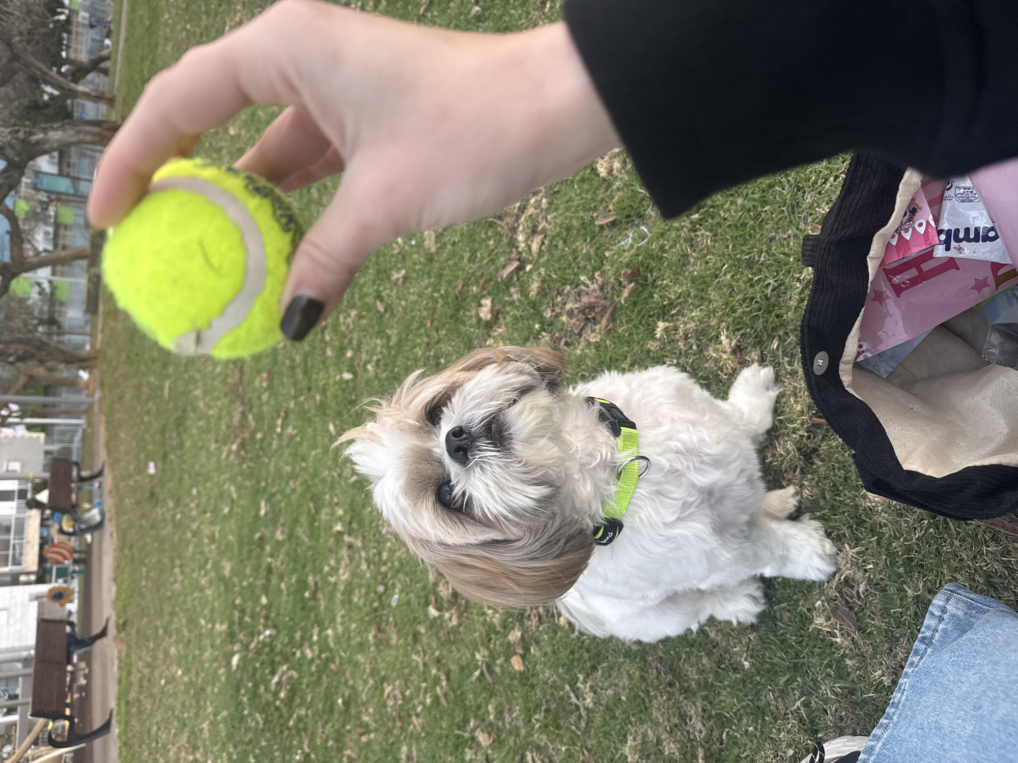 Shih Tzu dog sitting on a grassy area. A hand is holding a tennis ball above the dog's head. The dog is looking up at the ball. In the background, there are benches and trees. A black bag is partially visible next to the person. The setting appears to be a park. Based on the type of trees and the buildings that can be seen in the background, the location is likely in a city. The location given is Bat Yam, Israel, so it is likely that this photo was taken in a park in Bat Yam, Israel.