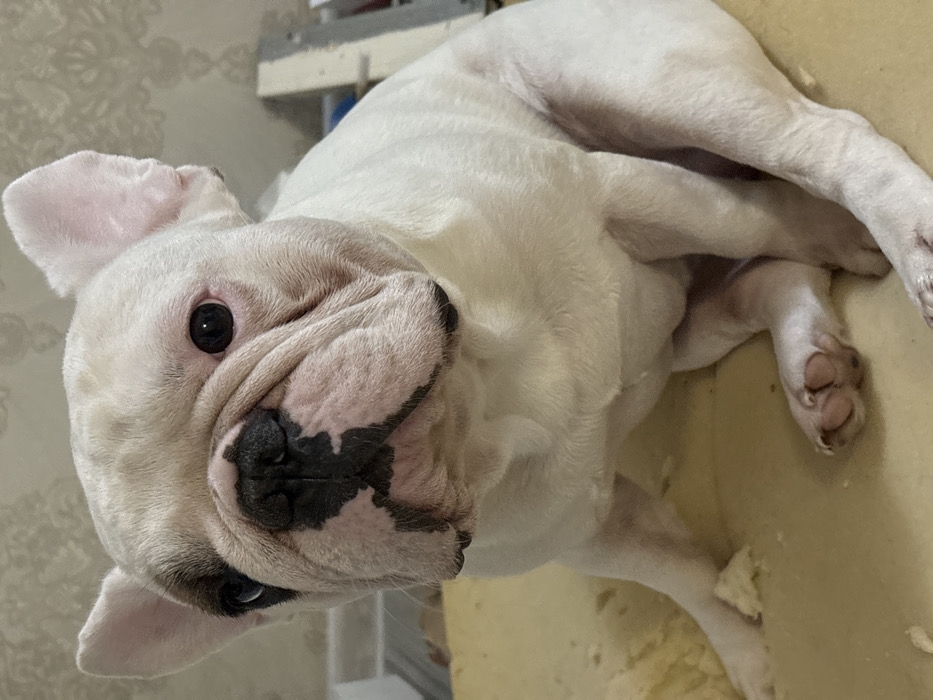 - "A white French Bulldog is depicted sitting upright in what appears to be an indoor setting in Chaikovsky, Russia" by FM-DSCl32, licensed under CC BY 4.0