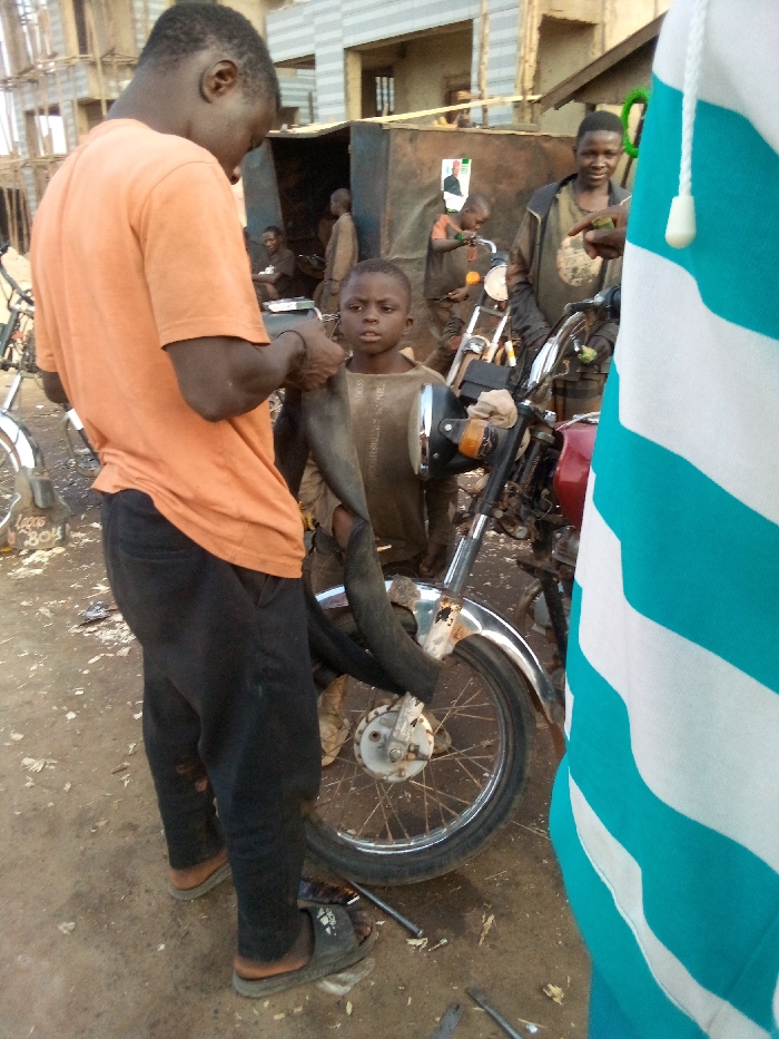 A man wearing an orange t-shirt is working on a motorcycle in an outdoor setting. A boy stands beside the bike, looking at the camera, wearing a brown shirt. The motorcycle's front wheel is visible, and tools are scattered on the ground. Other people are in the background, including one standing with a green object. Part of a blue and white striped fabric is on the right side. The setting appears to be a repair area or workshop.
