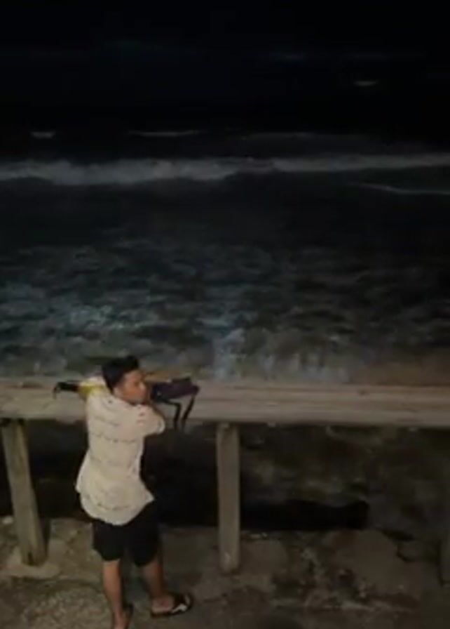 A person stands at the edge of a concrete pier on a dark night, facing the ocean. The person wears a light-colored patterned shirt, dark shorts, and sandals. They hold a cell phone to take a picture of the waves crashing against the shore. A dark-colored bag sits on the weathered wooden railing next to them. The ocean is dark with white-capped waves. The night sky is black.