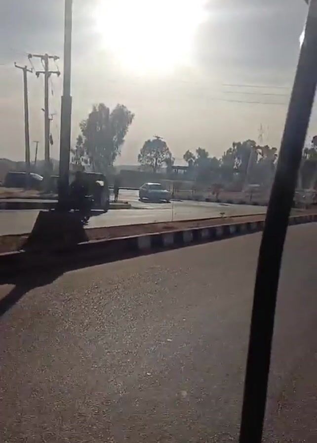 The camera pans slowly to the right along a paved road. On the opposite side of the road from the camera is a traffic circle with various cars and trucks. The sun shines brightly in the background. Power lines are visible in the distance. The sky is clear and bright. There are a few trees. At the end of the video, some structures with netting around them become visible.