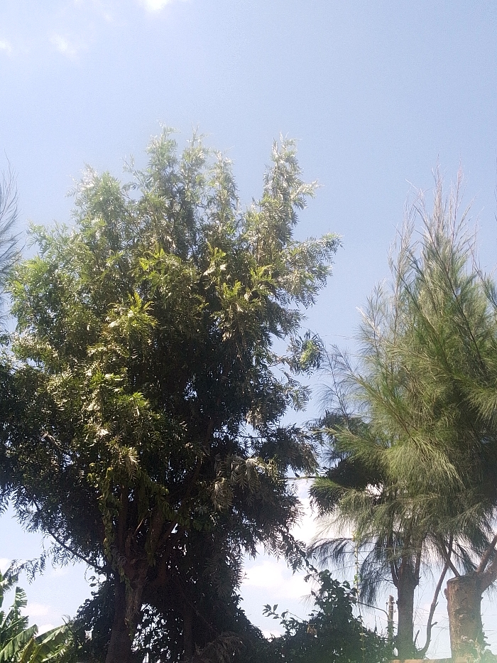 The image displays an outdoor, daytime scene in Nachu ward, Kenya, dominated by a clear, light blue sky featuring faint, sparse white cloud formations in the upper left quadrant. The lower two-thirds of the frame are occupied by dense vegetation. On the left and central portions, a large, broad-leaved tree with a thick canopy of predominantly green foliage extends upwards from the bottom edge. To the right, a separate group of trees with finer, wispy, needle-like, light green foliage is visible. A discernible tree stump or cut trunk is present on the far bottom right. Additional broad-leaved vegetation is visible at the bottom left, with smaller dark green foliage in the bottom center-right. No human subjects, animals, or artificial structures are present. The scene is brightly illuminated by natural light.