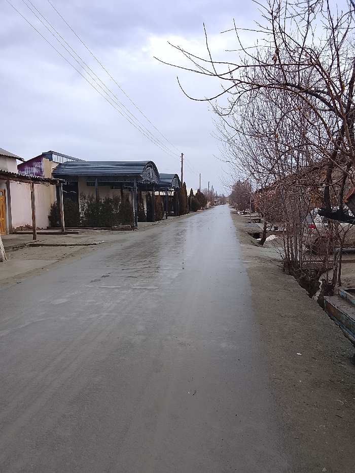 A wet, straight road stretches into the distance under a cloudy sky. The road is flanked by buildings with dark roofs and trimmed hedges on one side, and bare trees and a narrow ditch on the other. Utility poles line the road. The overcast conditions create a muted color palette with shades of gray and brown dominating the scene.