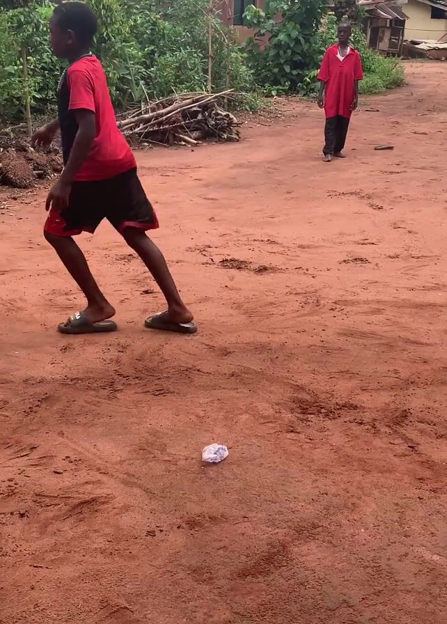 A young person in a black and red shirt and black shorts juggles a brown ball in a red dirt yard. They are wearing flip flops and a cross necklace. An adult in a red shirt and black pants walks in the background. A second young person in a white shirt and camouflage pants walks barefoot towards a palm tree on the right side of the screen. There are houses and trees in the background. A piece of white trash lies on the ground near the center of the screen.