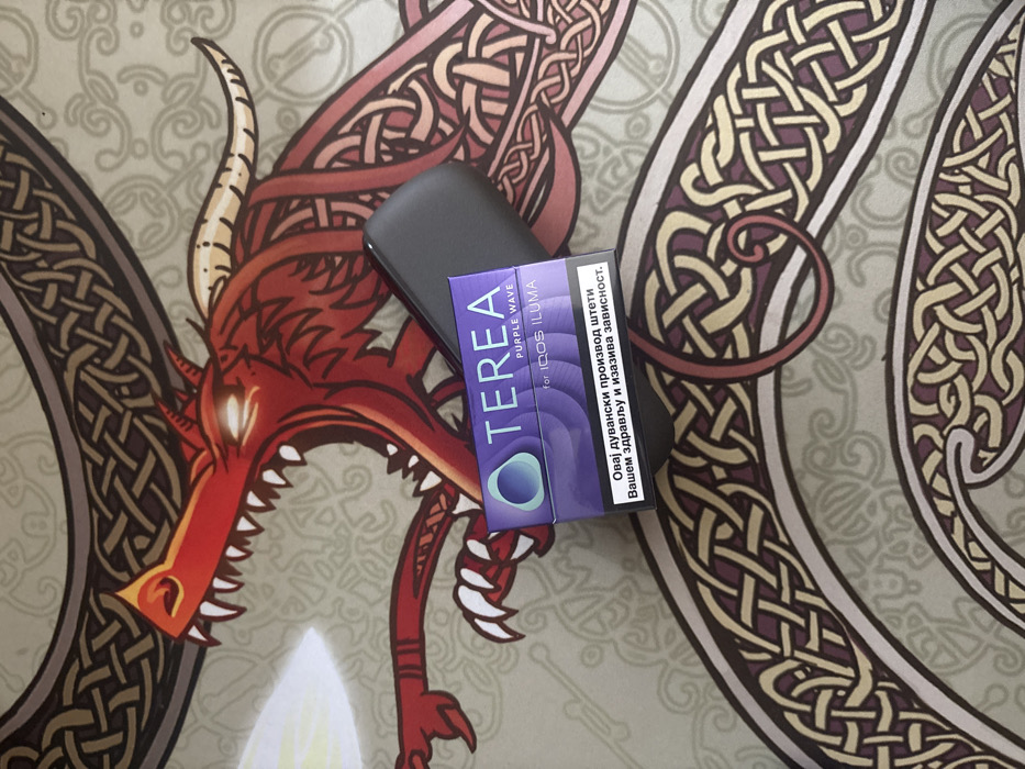 An indoor scene in Beloslav, Bulgaria, displays three primary objects arranged on a decorated surface. The surface is a light-colored mouse pad featuring a large red dragon illustration with glowing orange eyes, open mouth, and prominent teeth, possibly breathing fire, surrounded by intricate Celtic knot patterns in shades of brown, red, and purple. Positioned prominently in the foreground is a rectangular, purple-colored box of "TEREA PURPLE WAVE for IQOS ILUMA." The box includes a white and light blue circular logo and a white warning label in Bulgarian stating: "Овај дувански производ штети вашем здрављу и изазива зависност." Behind and partially obscured by the TEREA box is a sleek, dark gray or black electronic device, likely an IQOS ILUMA holder or pocket charger, with smooth, rounded edges. No individuals are present or visible in the image. The items are stationary, suggesting they have been placed on the mouse pad.
