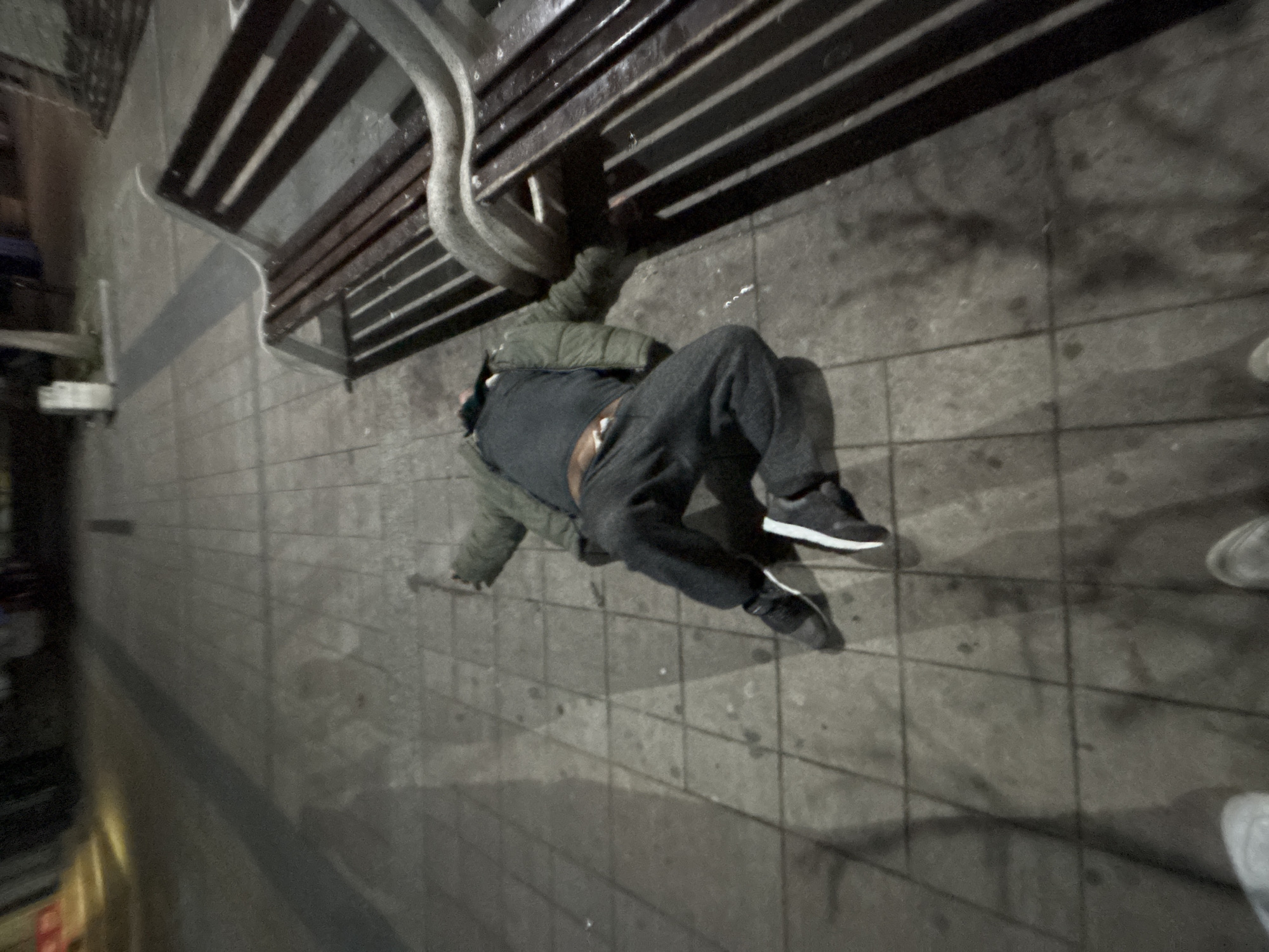 - "A person wearing a jacket and sweatpants lies on the ground next to a park bench on a paved surface" by FM-1U2Xt2, licensed under CC BY 4.0
