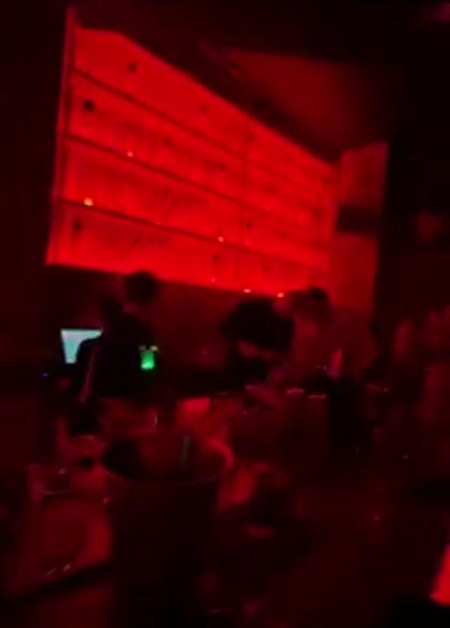crowded nightclub, likely at night, with many people milling around and enjoying themselves. The lighting is predominantly red, giving the entire scene a warm, vibrant feel. There's a bar area visible in the foreground, featuring various bottles and glassware. The ceiling has interesting light displays, including what appears to be an LED screen showing abstract patterns. Most people seem to be socializing and dancing.