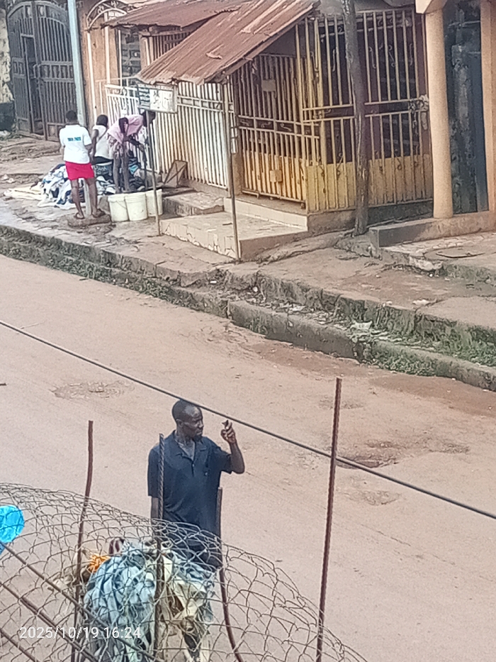 This image captures a street scene in Enugu, Nigeria. The foreground is partially obscured by a wire mesh structure containing light-colored fabrics, with two vertical metal rods and a horizontal black cable crossing the lower frame. In the mid-ground, a dark-skinned male, wearing a dark blue polo shirt, stands facing left. His right hand is raised, holding a small dark object. Behind him, a reddish-brown dirt road runs horizontally, leading to an elevated concrete sidewalk with a damaged curb and a narrow, overgrown drainage ditch. On the sidewalk, three individuals are observed. A male, wearing a white t-shirt and red shorts, stands barefoot near a large pile of light-colored clothing. Two females are positioned nearby; one in a pink top leans over two white plastic buckets. The other female wears a white top. This group appears to be engaged in an activity involving laundry or sorting clothes. The background consists of several urban structures. On the right, a building with a yellow-painted metal grille facade, a rusted corrugated metal roof, and light brown walls suggests a commercial stall or kiosk. To its left, another structure with a similar rusted roof and white metal railings is visible. Further left, a large, dark metal gate, possibly a residential or compound entrance, is present. The environment appears to be a busy, somewhat weathered urban area.
