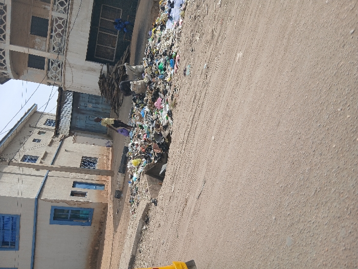 An image depicts a street scene with significant waste accumulation. A large pile of mixed refuse, including plastic and other materials, is present beside a building. A child and another individual appear to be in the vicinity of the waste. The street surface is made of dirt. Buildings with varying styles and blue accents are visible on the left side. The image suggests environmental pollution and potential sanitation issues.