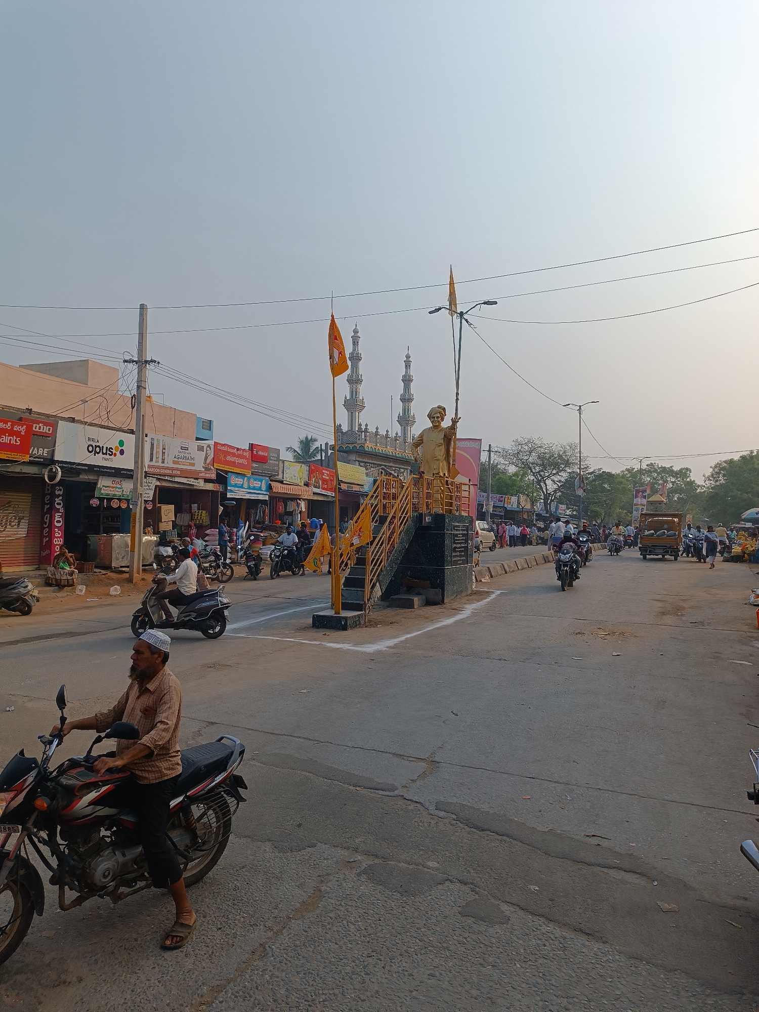 street scene in Kothacheruvu, India. A statue stands on a platform in the middle of the road. Two orange flags are placed on the platform. Motorcycles are driving on the street, and people are walking on the sidewalks. Shops line the street. There is a mosque with two minarets in the background. The sky is overcast.
