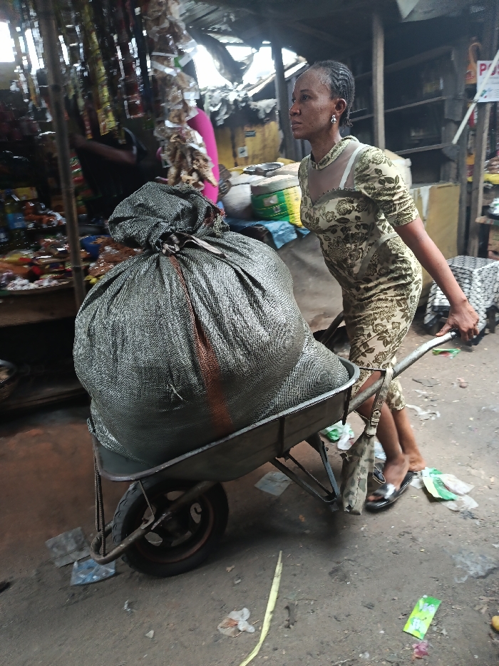 An adult female is depicted in a bustling market environment in Nkpor, Nigeria, actively pushing a metal wheelbarrow containing a large, grey, woven sack