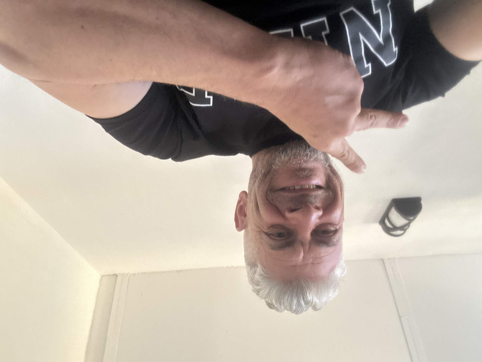 A man with gray hair and a black t-shirt is taking a selfie indoors. He is upside down in the frame and making a hand gesture. A light fixture is visible on the ceiling. The location cannot be determined from the image.