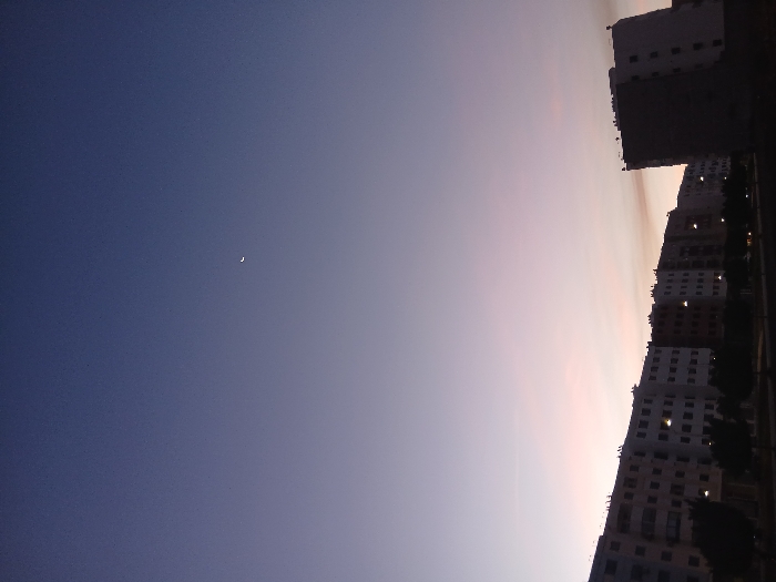 A serene evening scene features a crescent moon suspended in a gradient sky transitioning from deep blue to soft pink hues. Tall, illuminated buildings with multiple stories form a vertical line along the right side of the frame. Silhouetted trees line the street beside the buildings, adding depth and texture to the urban landscape. The photograph's composition emphasizes the quiet stillness of the moment.