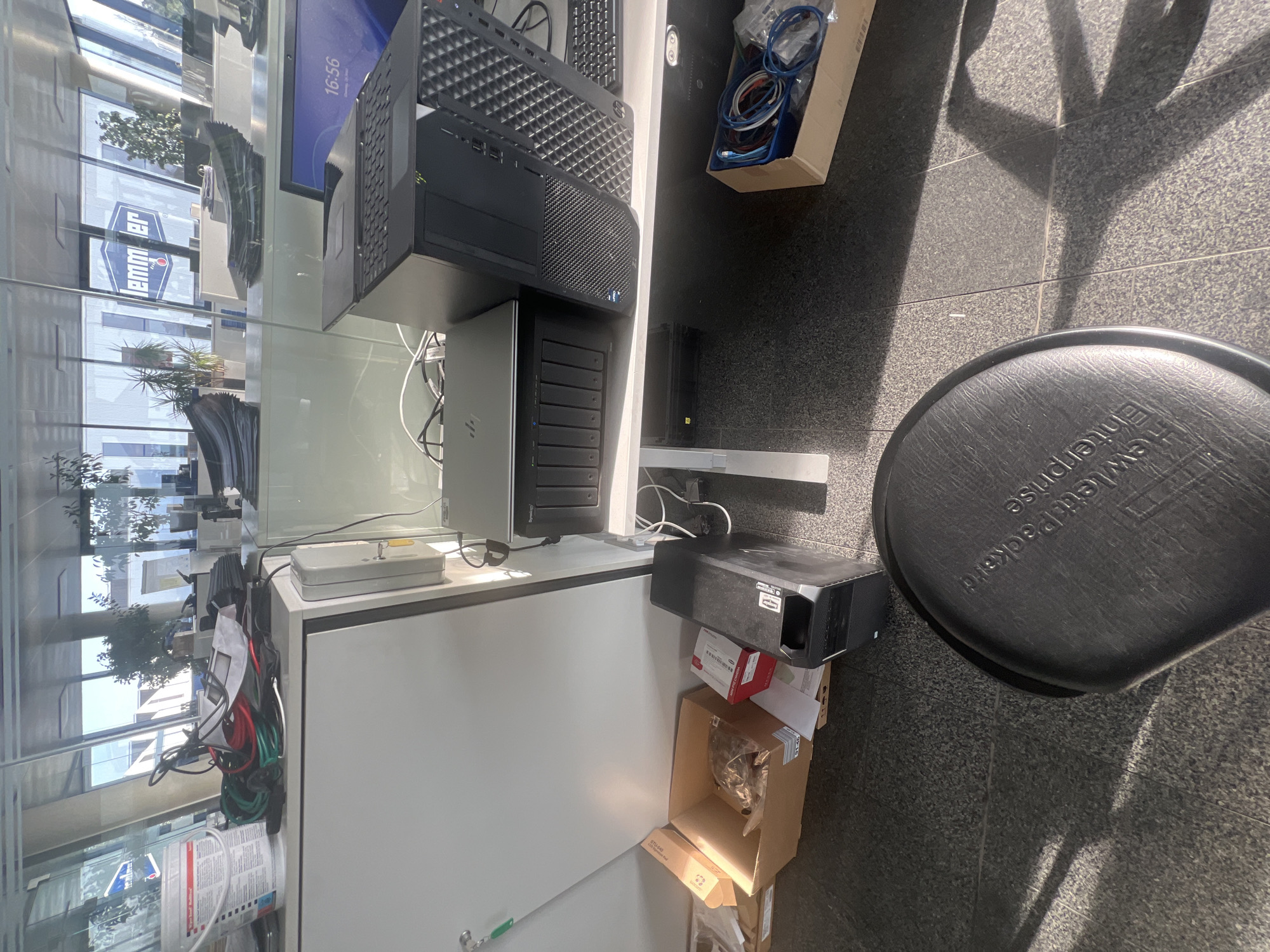 The image depicts an indoor office or workshop environment located within the premises of Lemmer GmbH & Co. KG in Heimertingen, Germany, as evidenced by the "lemmer" logo visible through the glass partition in the background. The scene focuses on a technical workspace. In the foreground, a partial view of a black circular stool with "Hewlett Packard Enterprise" embossed on its surface is visible, resting on a dark grey speckled tiled floor. Sunlight casts distinct shadows across the floor. To the left, a white cabinet or storage unit is present. On its top surface, a white plastic bucket labeled "Water-Repellent Multicoat" is positioned alongside a tangle of various colored cables (green, red, black) and some papers. Below the cabinet, on the floor, are two open cardboard boxes. One box contains items wrapped in plastic, while the other holds a red and white box (partially labeled "nine-pin"). Adjacent to these boxes is a small, dusty black desktop computer tower with a white sticker. To the right, a white desk surface holds several pieces of computer equipment. From left to right, a silver HP laptop is partially visible, followed by a black Synology Network Attached Storage (NAS) device with multiple drive bays. Next to the NAS is a black HP desktop computer tower with a diamond-patterned front grill and an "Intel Core i" sticker. A black computer keyboard is positioned to its right. A monitor displaying "16:56" on a blue background is also on the desk. Below the desk, a brown cardboard box contains various coiled cables in blue, white, and red colors. Another dark, rectangular object rests on the floor underneath the NAS. The background, visible through a glass partition, shows additional office space with white desks, office chairs, and potted plants. Further behind, through an exterior window, structures of buildings and trees are discernible under bright daylight. No individuals are present in the image. The arrangement of equipment, cables, and boxes suggests an active technical workspace, possibly undergoing setup, maintenance, or storage operations.