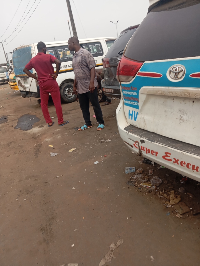 This image depicts a commercial area in Onitsha, Nigeria, characterized by a dirt ground littered with debris. Two adult males are visible in the mid-ground. One man, wearing a red polo shirt and red trousers, stands with his hands on his hips, facing away from the camera. Another man, wearing a plaid short-sleeved shirt, dark trousers, and light-blue sandals, stands facing the first man, looking towards him. Multiple vehicles are present. In the right foreground, the rear of a white Toyota Sienna minivan is partially visible, featuring a blue and white decal, a Toyota emblem, and "SIENNA" lettering. Below the rear window, "Customer Care" and phone numbers (08061607539, 08138282227) are printed, along with "HV." The lower bumper reads "Super Execu" in red, with considerable dirt and debris accumulated beneath it. Behind the Sienna, a darker SUV or minivan is partially visible, with a person potentially working on its rear wheel. In the left-midground, a white minibus, possibly a commercial passenger vehicle, shows visible damage to its rear bumper and bodywork, with "TRANSPORT CO" text partially discernible on its side. Overhead, utility poles and multiple electrical wires crisscross a light-gray sky.