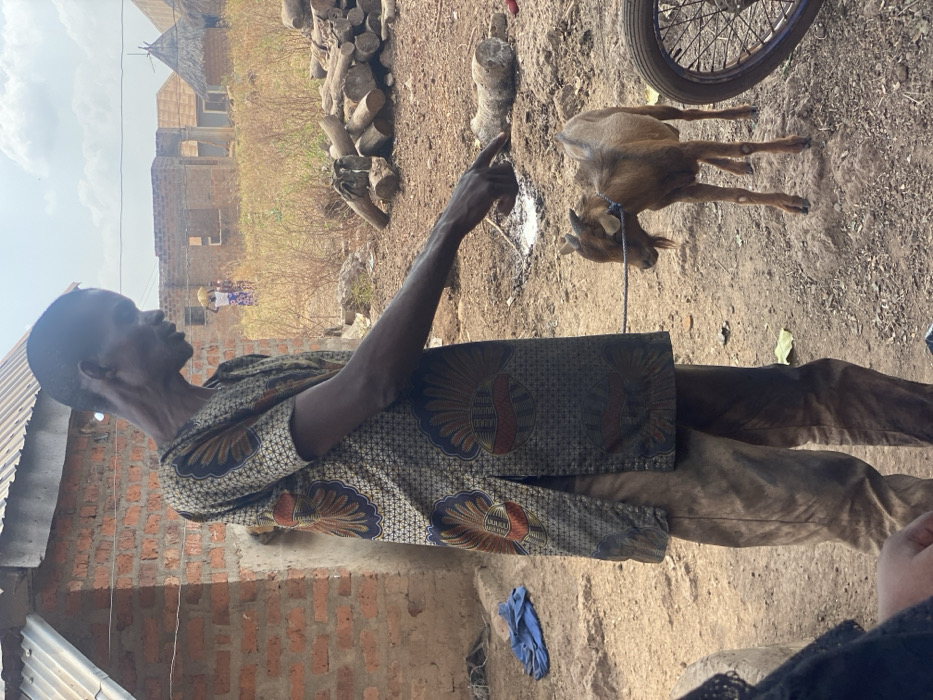 This image depicts an outdoor scene in Nev, Nigeria. A slender, dark-skinned male, appearing middle-aged or elderly, stands in the foreground, facing right in profile. He wears a short-sleeved patterned tunic with gold, brown, and red motifs on a dark background, and soiled brown trousers. His right arm is extended, index finger pointing downwards towards the ground. To his right, a small, light brown goat with short horns and a goatee stands tethered by a blue rope around its neck. The ground is dry, reddish-brown dirt. Behind the man, an unfinished brick structure with a corrugated metal roof is visible. Further in the background, sparse dry vegetation, a pile of cut logs, another partially constructed building, and a small conical-roofed hut are present. A small area of white liquid is on the ground near where the man is pointing. A partial view of a bicycle or motorcycle wheel is visible on the far right. In the distant background, two human figures are faintly visible, one carrying an item on their head. A dark-skinned arm belonging to an unseen person is partially visible in the bottom left foreground. The sky is hazy blue with scattered clouds, indicating daylight.