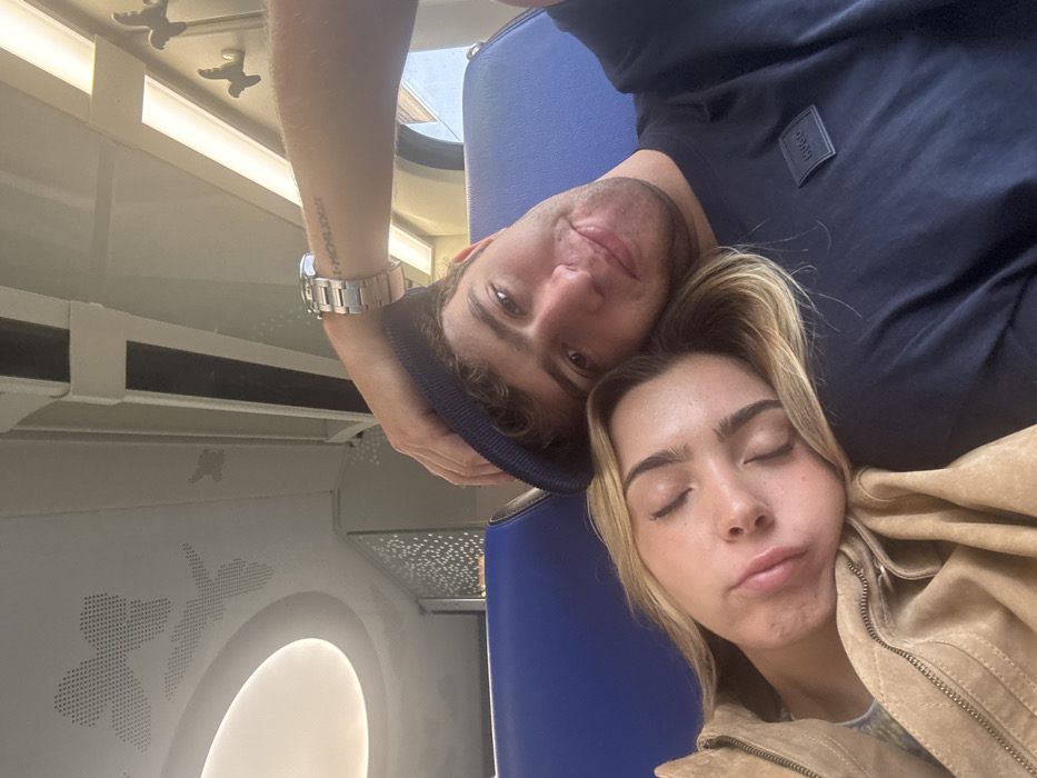 Two individuals, one female and one male, are seated within a Dutch Railways (NS) train carriage, consistent with train services operating within or passing through Eindhoven, Netherlands. The female, positioned on the left, has blonde hair and her eyes are closed, indicating rest or sleep. Her head is resting on the male's left shoulder. She is wearing a light brown or tan jacket with visible zipper details. The male, on the right, has brown curly hair and is looking directly at the camera with a neutral to slightly smirking expression. He wears a dark blue t-shirt featuring a black square "HUGO" brand patch on the left chest. A silver-colored metal watch is on his left wrist, and a tattoo displaying Roman numerals "I-MCMLXXX" is visible on his left forearm. His right hand is raised, partially obscured by a dark blue beanie or cap worn on his head. The immediate environment consists of blue upholstered train seats. The background reveals a modern train interior with a white ceiling panel featuring perforated patterns resembling birds or butterflies, and a large circular overhead light fixture. Horizontal support beams or luggage racks are visible in the upper right of the frame. The perspective suggests a self-portrait taken by one of the individuals.