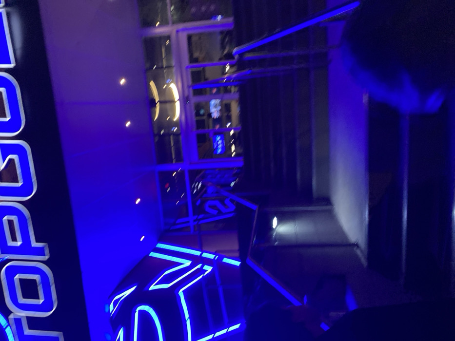 A nighttime view of a building interior, likely Topgolf, is showcased. A wall featuring blue neon-lit "TOP" signage is prominent, with additional neon elements in the foreground. Large windows reveal a cityscape in the background, with building lights visible. The scene is illuminated with a strong blue light, creating a vibrant and modern atmosphere. Stairs or a seating area are visible, adding depth to the composition. A person’s head is visible in the top right corner of the frame.
