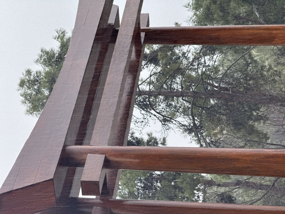 A close-up shot presents a reddish-brown, wooden structure resembling a ladder or architectural frame against a backdrop of green pine trees. The sky appears overcast. The wooden elements are wet, displaying a glossy sheen. The composition focuses on the juxtaposition of the structured wooden form and the natural, organic shapes of the trees.
