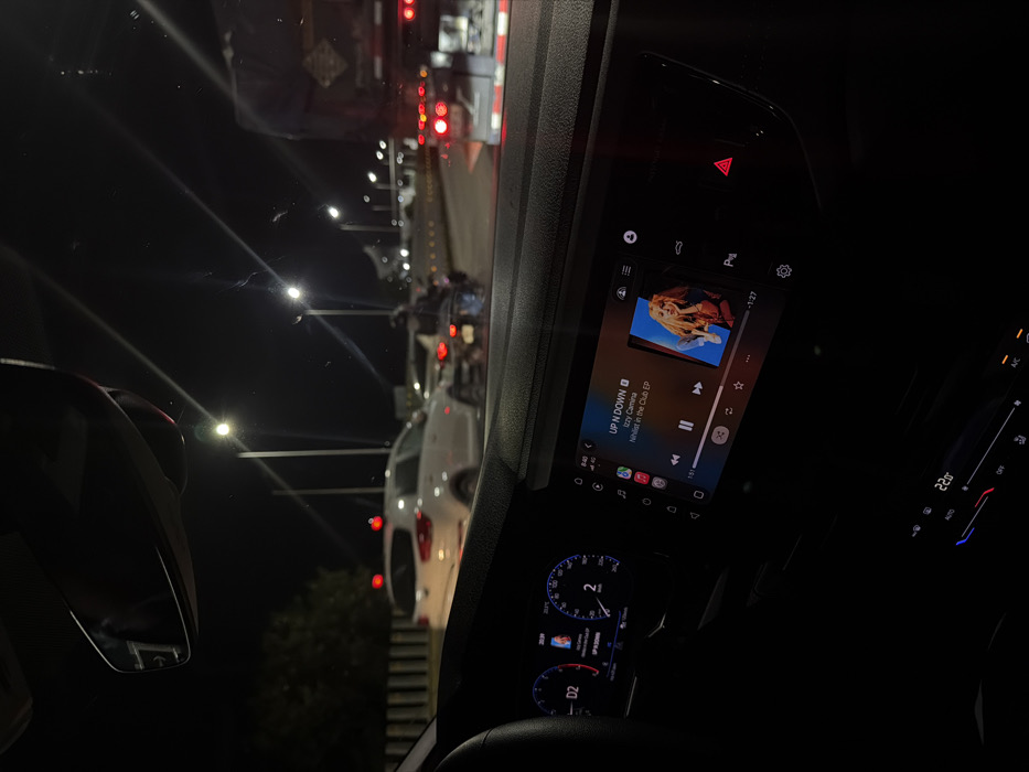 Captured from inside a vehicle at night, the scene depicts a traffic jam under streetlights