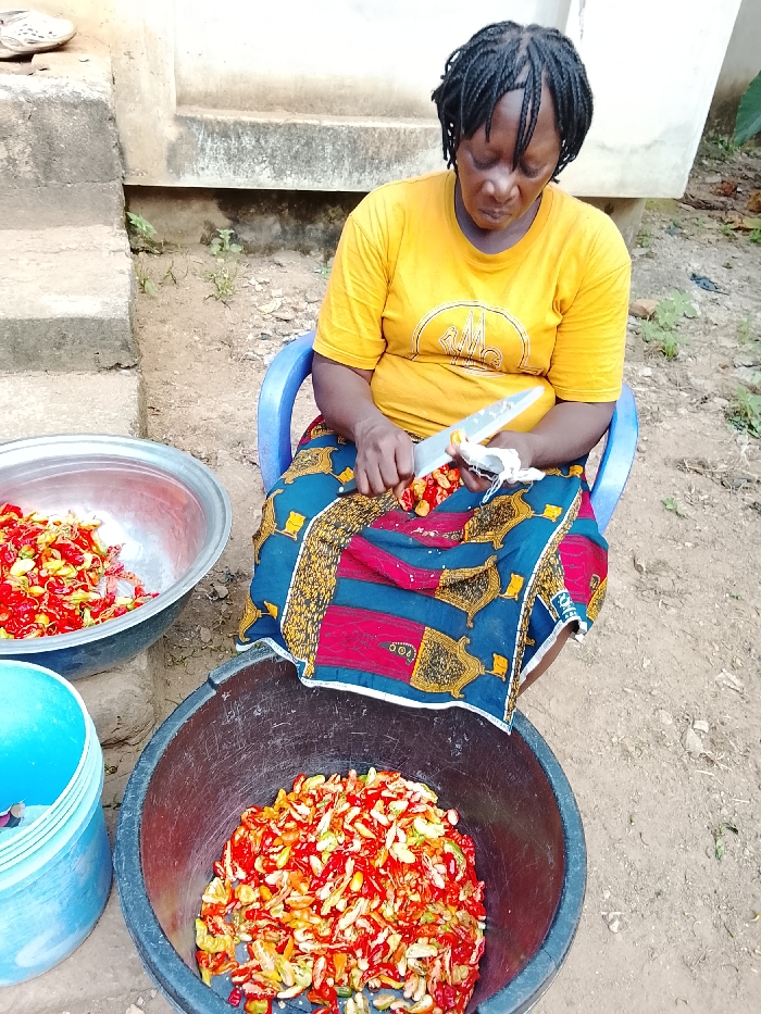 An adult female is depicted seated outdoors on a blue plastic chair in Akwanga, Nigeria. She wears a yellow short-sleeved t-shirt with a graphic on the front and a patterned wrapper (skirt) predominantly in blue, red, and yellow. Her dark hair is styled in braids. She is actively engaged in preparing produce, holding a large silver-bladed knife in her right hand and a light-colored item in her left hand, appearing to be peeling or slicing. In the immediate foreground, a large, dark grey plastic basin is filled with numerous chopped items, primarily red, orange, and yellow peppers or similar vegetables. To her left and slightly behind, a silver-colored metallic basin contains a smaller quantity of similar chopped produce. A light blue plastic bucket is partially visible on the far left. The ground consists of light brown earth with scattered sparse vegetation. In the background, a light-colored concrete structure with visible steps is present. A single light-colored sandal rests on this concrete structure in the upper left.