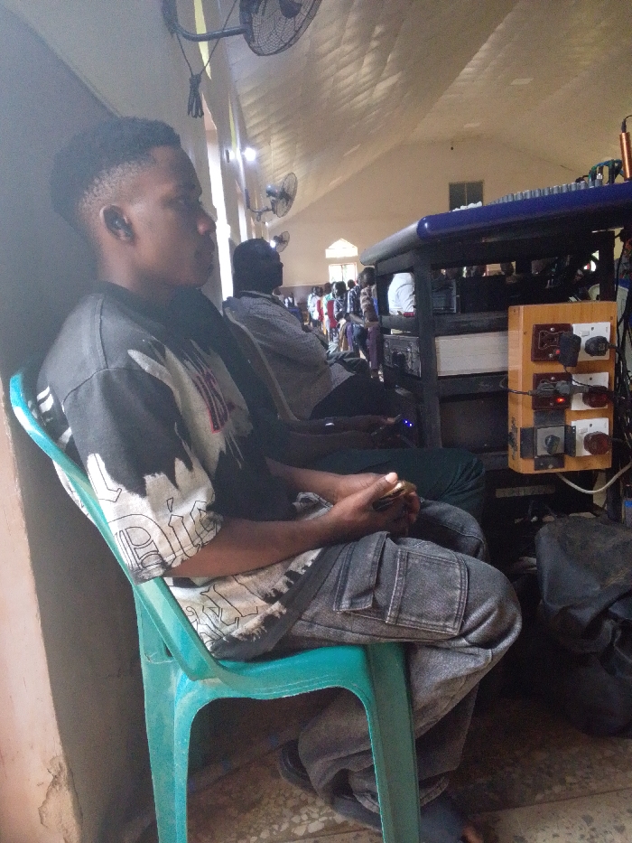 An indoor scene depicts a gathering within a large hall, likely a place of worship, in the city of Unknown, Unknown. In the foreground, a young Black male with a fade haircut sits in profile on a teal plastic chair, facing right. He wears a black t-shirt with white and red graphic elements and dark grey cargo pants. His hands are clasped, holding a small, light-colored object, and a white earbud is in his left ear. Behind him, another adult Black male is partially visible, seated and facing right, wearing a light-colored collared shirt. To the right, a dark shelving unit holds sound equipment, including a blue-topped mixing console. A wooden panel on the right side of the shelving unit features three electrical outlets with illuminated red indicators, and multiple power cords are connected. In the background, numerous indistinct individuals are seated in rows, facing away from the camera. The hall features a high, vaulted, light-colored ceiling with multiple white oscillating fans mounted overhead. A distinct window structure is visible on the far back wall. The floor is light-colored and appears to be concrete or tiled. A dark bag rests on the floor to the right of the sound equipment.