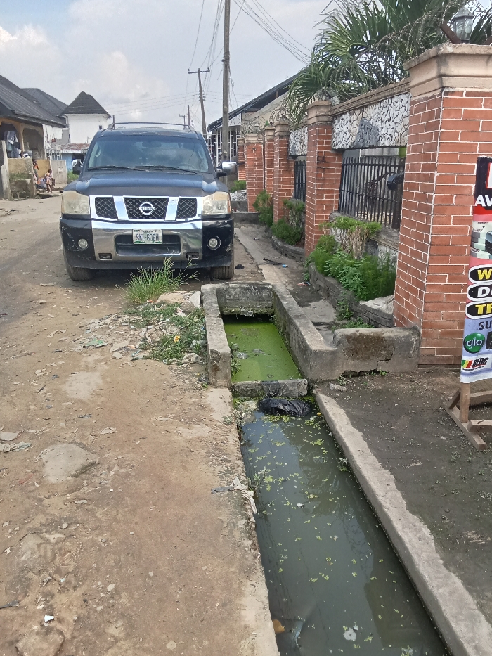 black Nissan Armada parked on a dirt road in Asubi, Nigeria, at coordinates 5.58 latitude, 5.822 longitude. The car is facing away from the camera and is parked in front of a concrete drainage ditch. The ditch is filled with green algae and standing water. There is a black plastic bag floating in the water. There are brick buildings on the right side of the image, with a brick fence and a metal gate. There is a sign on the fence advertising the Glo network. The road is dirt and dusty. There is debris in the ditch and on the road. There are no people visible in the image.