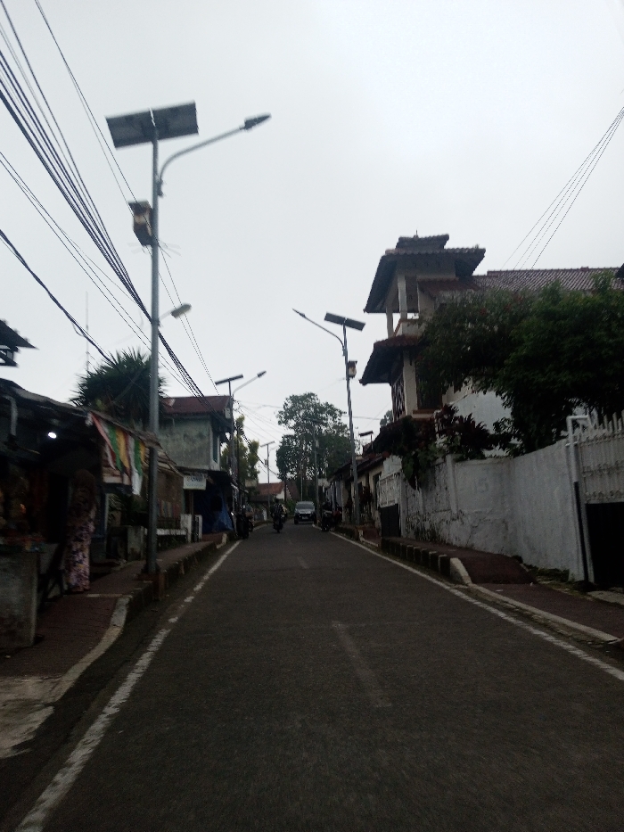 A quiet road stretches into the distance, bordered by an assortment of buildings. On the left, small shops with colorful canopies and utility poles dominate the view. To the right, a walled property with a unique multi-tiered building stands out. Solar-powered streetlights line the road. A car and a couple of motorcycles are seen in the distance, heading up the road. Overcast sky above.