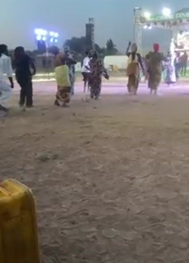 In a wide shot, a group of around 10 people are dancing in an open, sandy area. They are of varying ages and are dressed in traditional African clothing, with a mix of bright and subdued colors. In the background, a stage is visible with “ChoCo Covetales” displayed on it. Stage lights are shining down, illuminating the area. Several other people are standing around, some watching the dancers and others walking by. The sky is a pale blue, suggesting either dusk or dawn. A yellow jerrycan sits in the foreground, partially obscuring the view. The ground is dry and marked with footprints. The overall atmosphere is festive and lively.