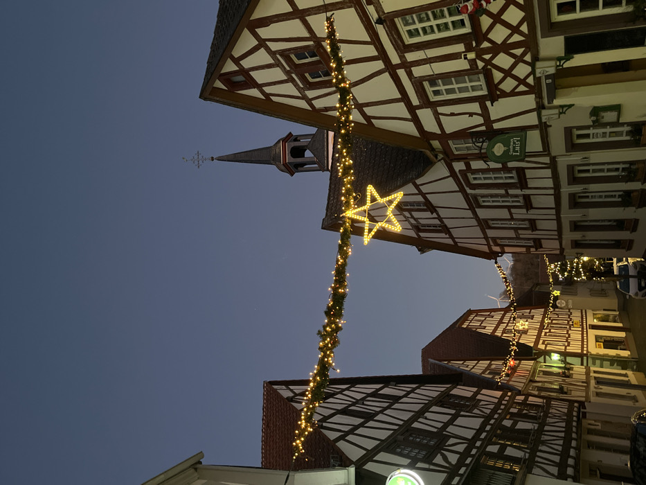 This image presents a street scene in Meisenheim, Germany, observed at either dusk or dawn under a deep blue, clear sky