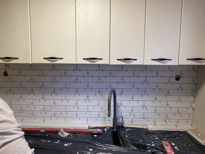 This image captures an interior kitchen renovation scene in Ivailo, Bulgaria, focusing on the installation of a tile backsplash. Six light-colored upper kitchen cabinets with black, horizontally oriented handles are visible across the top of the frame. Below these cabinets, a new backsplash is being constructed with light-toned rectangular subway tiles laid in a horizontal offset pattern. Numerous white cross-shaped tile spacers are present between the tiles, indicating the tiling process is ongoing. Two circular cutouts for fixtures or outlets are visible in the tile work, one on the left and one on the right. A stainless steel gooseneck faucet extends from a counter area that is largely covered by black protective plastic sheeting. White residue, likely tile adhesive, is scattered on the plastic. A red spirit level is positioned horizontally on the counter beneath the newly laid tiles, and another smaller red spirit level rests on the black sheeting to the right. The left arm and partial torso of an individual wearing a light-colored long-sleeved garment are visible in the lower-left corner, suggesting active work in progress.