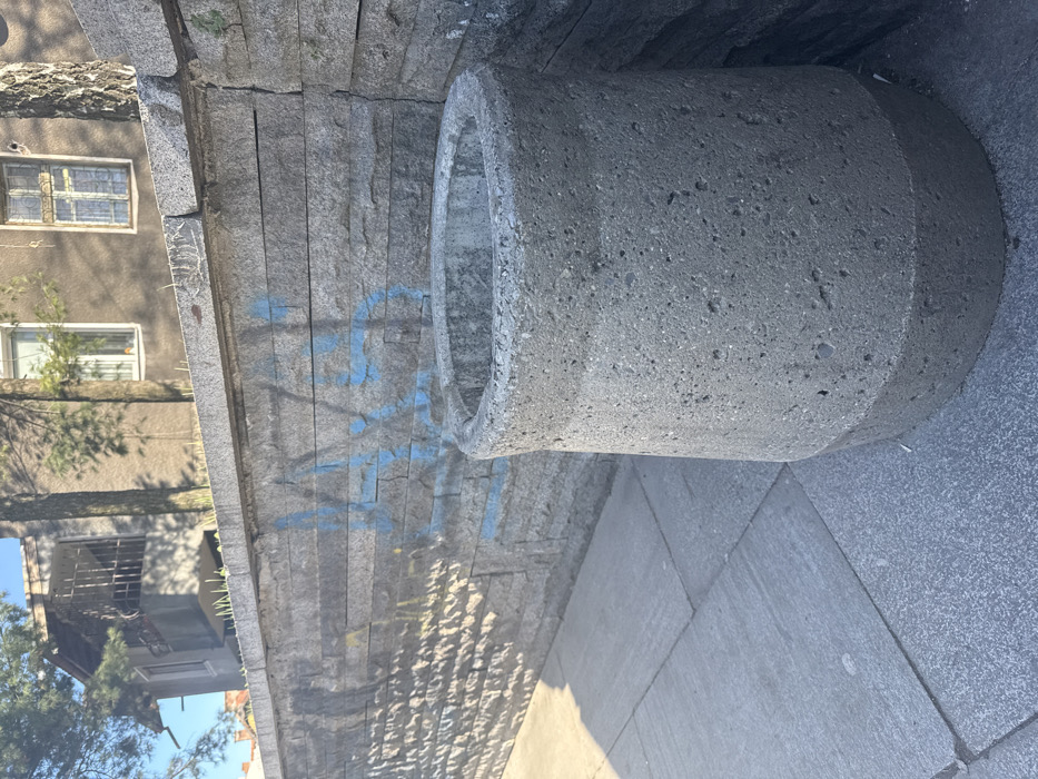 The image displays an outdoor urban environment in Kyustendil, Bulgaria. A grey, cylindrical concrete trash receptacle, approximately one meter in height, occupies the right foreground, standing on a paved surface of large, light grey square tiles. The receptacle features a visible aggregate texture and a slightly darker, wider base segment. Behind the receptacle, a retaining wall constructed from horizontally stacked, rectangular grey stone blocks extends across the midground. Multiple instances of faded blue spray-painted graffiti are present on the wall's surface. Strong sunlight, originating from the left, casts distinct shadows onto the paved ground and the lower left section of the retaining wall. In the background, beyond the retaining wall, multiple urban structures and foliage are visible. To the left, a building with a balcony featuring white vertical railings is partially obscured by tree branches. To the right, a darker-toned building presents two windows with white frames. Several trees with visible trunks and green foliage are dispersed throughout the background, situated between and behind the structures. No individuals or specific actions are depicted within the frame.
