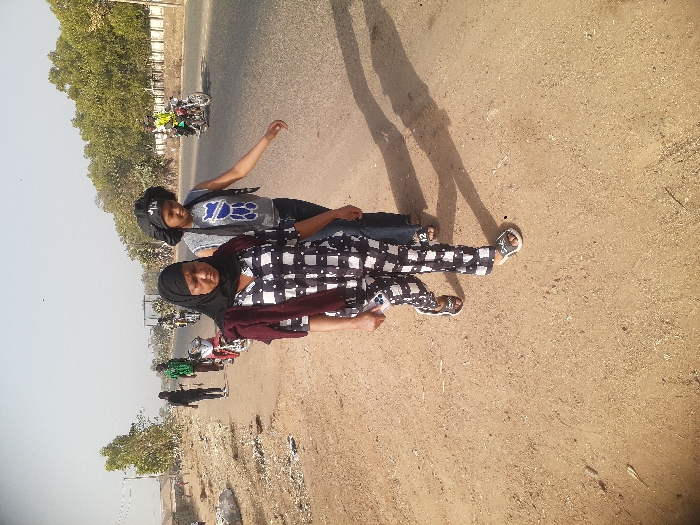The image displays an outdoor scene on a sunny day in Bauchi, Nigeria, along a roadside. In the foreground, two females walk from left to right on a wide, dusty reddish-brown dirt shoulder. The lead individual, an adult female, wears a black hijab, a black and white checkered long-sleeved jumpsuit, and black and white slide sandals. A dark red garment is draped over her shoulders, and she holds a white smartphone in her right hand. Directly behind her and slightly to the right, a younger female walks, wearing a black sleeping cap, a gray sleeveless top with a blue teddy bear graphic, blue jeans, and open-toed sandals. Her left arm is slightly extended. To the left of the paved asphalt road in the midground, multiple individuals and motorcycles are present on the dirt shoulder. Three males are visible, one in a green shirt, standing near at least two parked motorcycles, one red and one dark-colored. Further down the paved road on the right, a person wearing a bright yellow or green vest is riding a motorcycle away from the viewer. The background on the right side of the road features a dense line of green trees with a low concrete wall visible beneath them. The left background shows sparser vegetation, scattered debris on the dirt, and utility poles or structures in the far distance. The sky is light and hazy, and distinct shadows on the ground indicate a high sun.