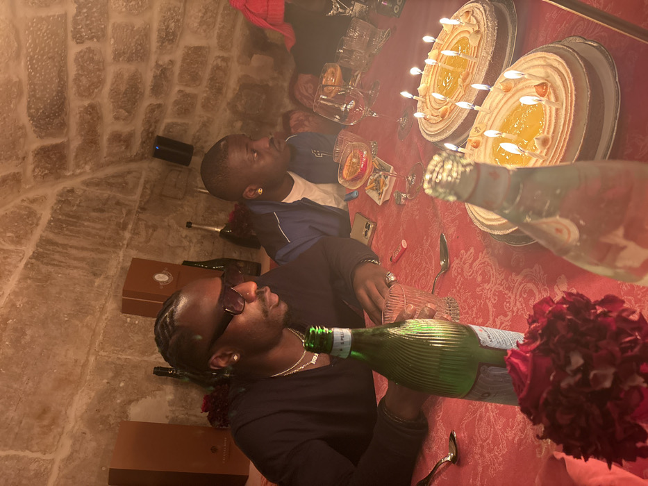 Two men sit at a red patterned table with two cakes lit with candles. One man wears sunglasses and a black shirt, pouring liquid from a green bottle into a glass. The other man wears a blue and white jacket. There are bottles, boxes, glasses, and spoons on the table. A bouquet of red flowers is on the right side. The setting appears to be indoors with stone walls.