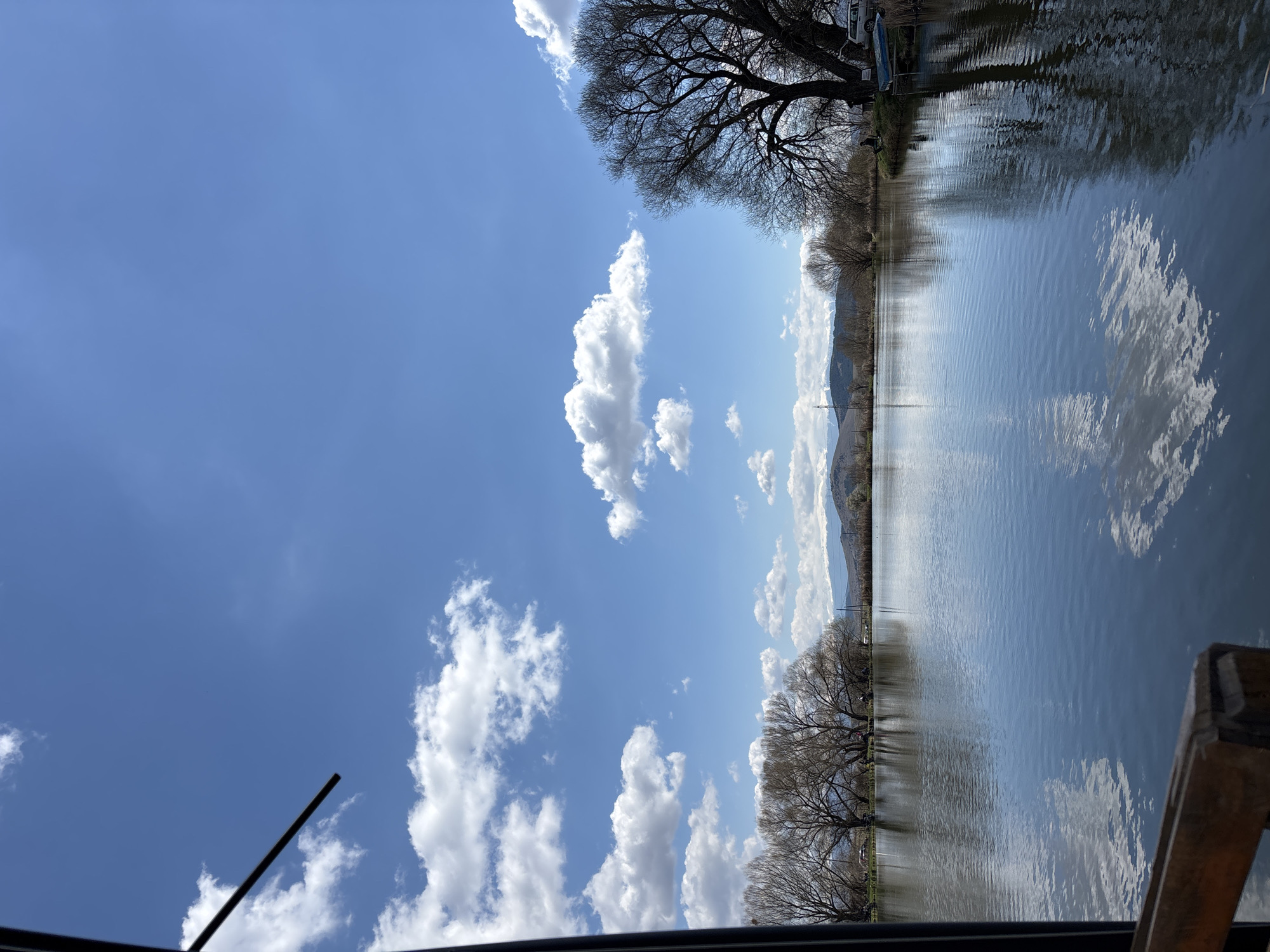 The image depicts a body of water reflecting the sky, with trees lining the shore