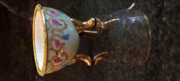 A small, decorative tripod bowl, approximately 8-10 cm in diameter, is depicted resting on a dark, reflective, speckled surface, likely polished granite. The bowl is crafted from light blue-green ceramic or porcelain, featuring a white interior and an ornate gold-colored rim with a textured edge. Its exterior is adorned with a repeating pattern of gold scrollwork, punctuated by pink five-petal flowers and small blue bell-shaped floral elements. The bowl is supported by three glossy, gold-colored, curved legs which cast clear reflections onto the surface below. The background is uniformly dark and out of focus, appearing to be a solid wall or fabric, providing stark contrast to the illuminated object. This scene is located in Meknes, Morocco.